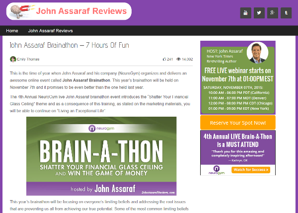 JohnAssarafReviews.com provides the detailed introduction and information related to this year’s Brainathon scheduled for November 7th 2015. The website content, just released and published for the event launch, describes the 2015 “Winning the Game of Money” free webinar as a special, deeply immersive event where the attendees can learn how to retrain their brain to quickly release the self-doubt, fear, embarrassment, shame, procrastination, and lack of confidence that might be holding them back from achieving greater financial success and freedom.