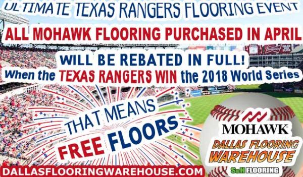 Dallas Flooring Warehouse is launching their “Ultimate Texas Rangers Flooring Event” sponsored by Dallas Flooring Warehouse and Mohawk Industries. They will be offering a full rebate on the total cost of all Mohawk flooring purchased in April of 2018 when then Texas Rangers win the 2018 World Series. Lucky customers who purchase Mohawk Flooring from any of the five Dallas Flooring Warehouse locations including Allen, Grapevine, The Colony, Granbury and Dallas during the month of April in 2018 will have their entire purchase refunded including installation when the Texas Rangers win the 2018 World Series.