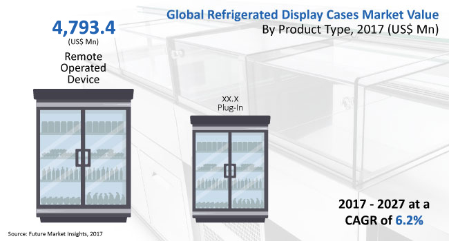 In terms of value, the global refrigerated display cases market is expected to grow at a CAGR of 6.2% during the forecast period. The global refrigerated display cases market was valued at US$ 8,412.4 Mn in 2016, and is projected to grow significantly to reach US$ 16,042.7 Mn by 2027 due to rapid growth of modern grocery stores and increasing demand for pre-packed frozen foods and frozen meet.