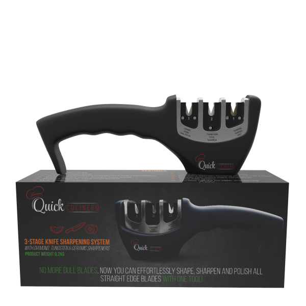 The business adds that “incorporating diamond, tungsten and ceramic sharpeners, the Quick Cocinero 3-Stage Knife Sharpener has been proven to create a razor-sharp edge for those looking to effortlessly shape, sharpen or polish all their straight edge blades, from kitchen knives and meat cleavers or chopping knives to pocket and fishing or military knives, with just one tool.”
